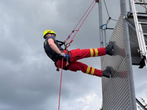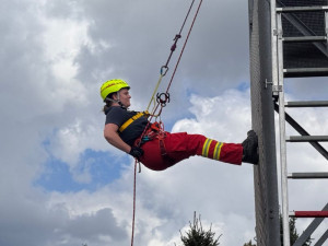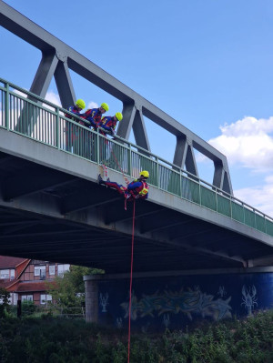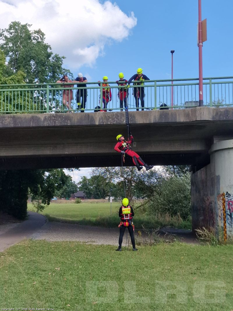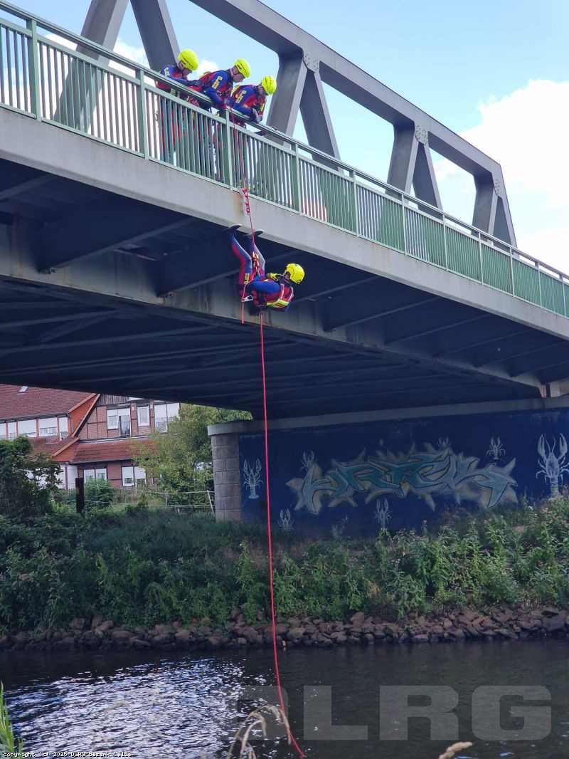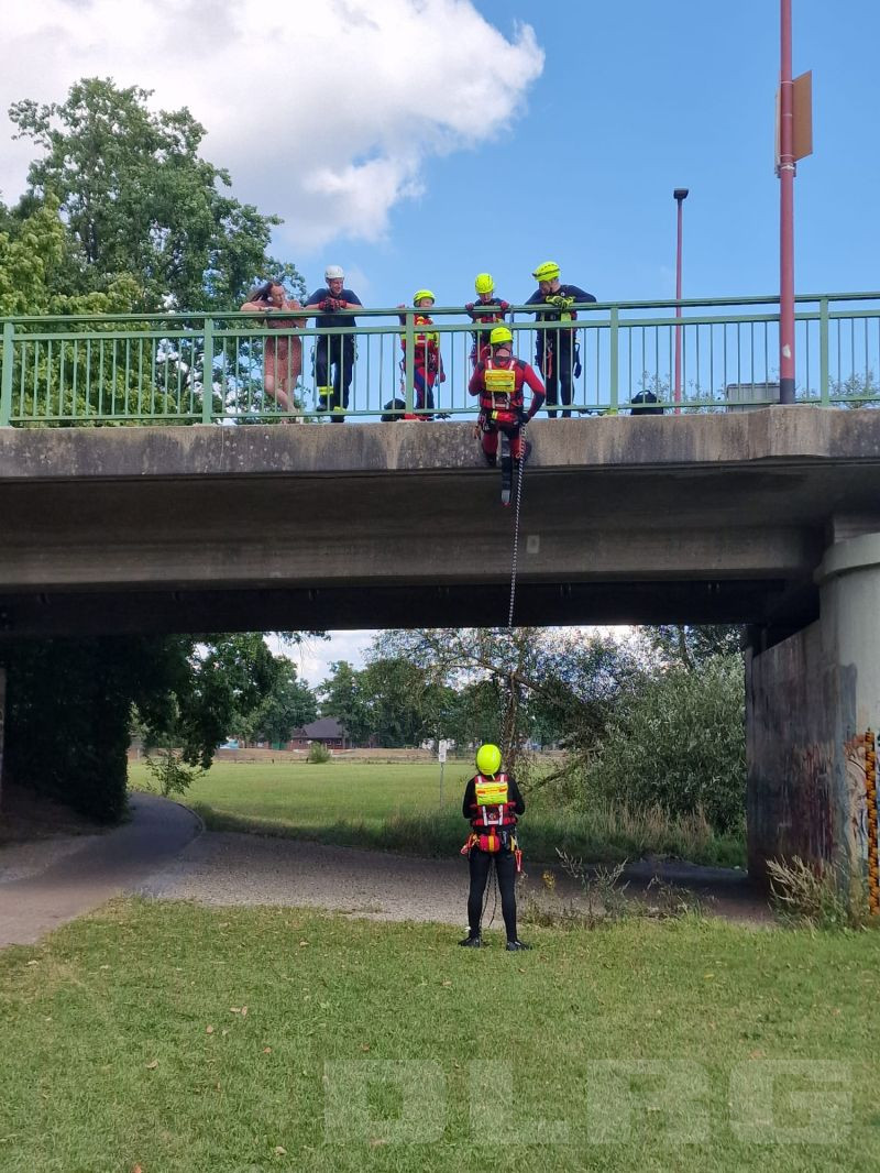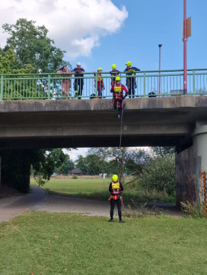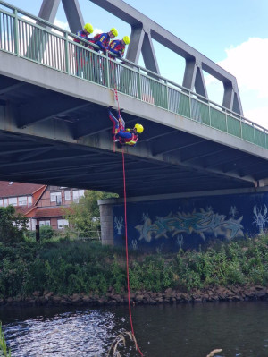 Nach einem gemeinsamen Mittagessen verlegte die Gruppe zur Allerbrücke. Dort hatten alle Teilnehmenden die Möglichkeit, sich entweder über Land oder direkt über dem Wasser abzuseilen. Für Fortgeschrittene bestand die Herausforderung darin, sich gezielt auf ein Boot abzuseilen – ein Manöver, das höchste Konzentration und präzise Kommunikation erfordert.